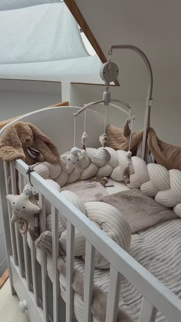 Le mobile musical bébé s’installe généralement au-dessus du lit ou du berceau, hors de portée des mains de l’enfant, afin d’assurer une utilisation sécurisée.